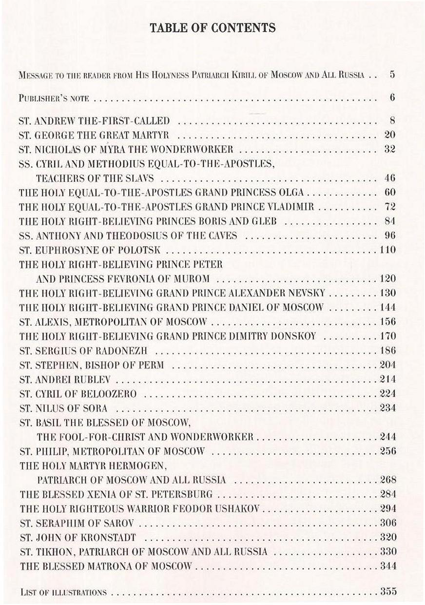 Альбом палехских миниатюр к сказаниям о наиболее почитаемых Русской Православной Церковью святых — равноапостольной княгини Ольги и великого князя Владимира, благоверных князей Александра Невского и Димитрия Донского, преподобного Сергия Радонежского, Патриархов Московских и всея России Гермогена и Тихона, блаженной Матроны Московской и др. Рассказ об их жизни, духовном подвиге и деяниях раскрывает самые яркие, героические и трагические страницы истории Православия и России. В основу описаний положены канонические жития, свидетельства, сохраненные в летописных сводах и легендах.