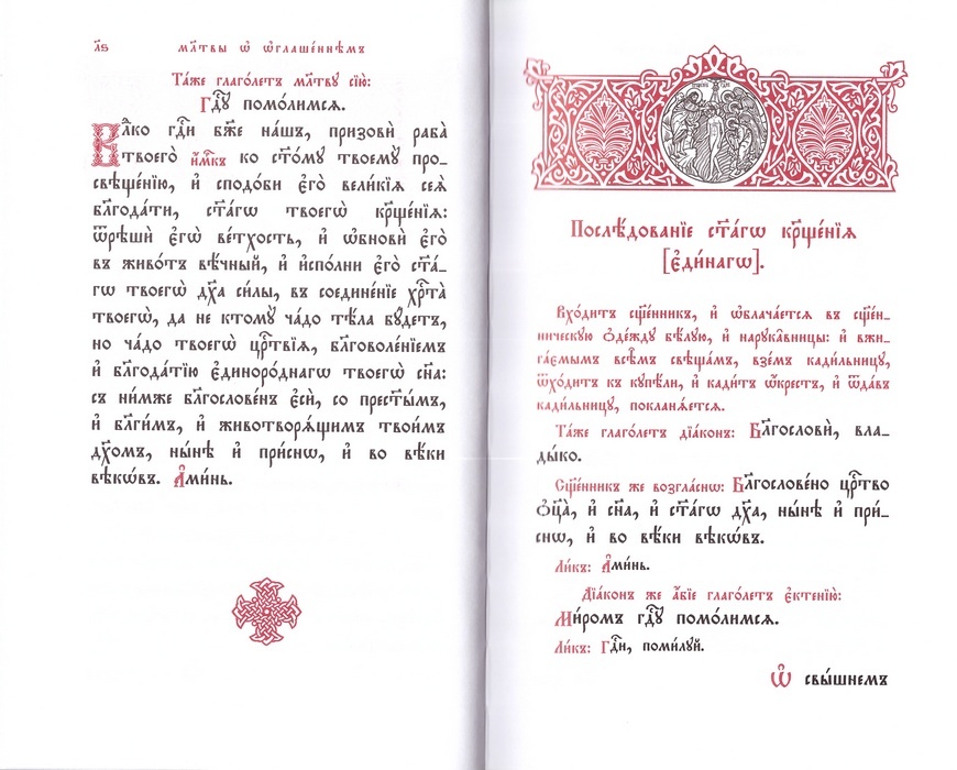 Требный сборник «Крещение» среднего формата напечатан в два цвета церковно-славянским шрифтом. Текст украшен оригинальными буквицами и орнаментами.