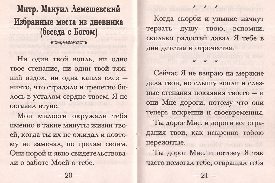 В эту брошюру входят известное духовное творение - «От Меня это было» и избранные места из дневника митрополита Мануила (Лемешевского) «Разговор Бога с душою человека».