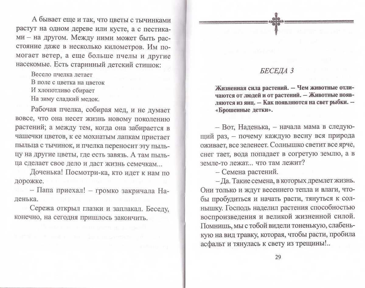 Надя не пошла в школу. - Почему забеспокоилась мама. - Начало брачного созревания организма девочки. - «Это больно?» — Как ведет себя девочка в такие дни. - Необходимо часто мыться! — Почему христиане называют это «нечистотой». - Поведение в церкви. - Зачем девочки делают пометки в календарике.