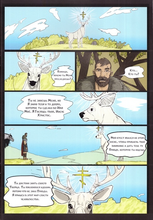 Римский военачальник Плакида обладал большой силой и влиянием. А ещё он был милосердным и искренним. Он очень любил свою жену, и у них росли два прекрасных сына. Однажды на охоте он увидел оленя. Между рогами оленя ярко горел крест. Так Плакиде явился Сам Господь и говорил с ним. Когда Плакида пришёл домой, то жена ему рассказала, что и с ней говорил Господь. Они всей семьёй крестились, его теперь звали Евстафий, а его жену — Феопистия. Жизнь успешного военачальника изменилась. Им предстояло вынести немало испытаний. У Евстафия были поводы усомниться в вере, но он принял всё с полным доверием к Богу. И Бог не посрамил его упования — и Евстафий, и его жена, и сыновья, пострадав мученически за Христа, стали святыми и теперь молятся у Престола Божия за всех, кто просит их о помощи.