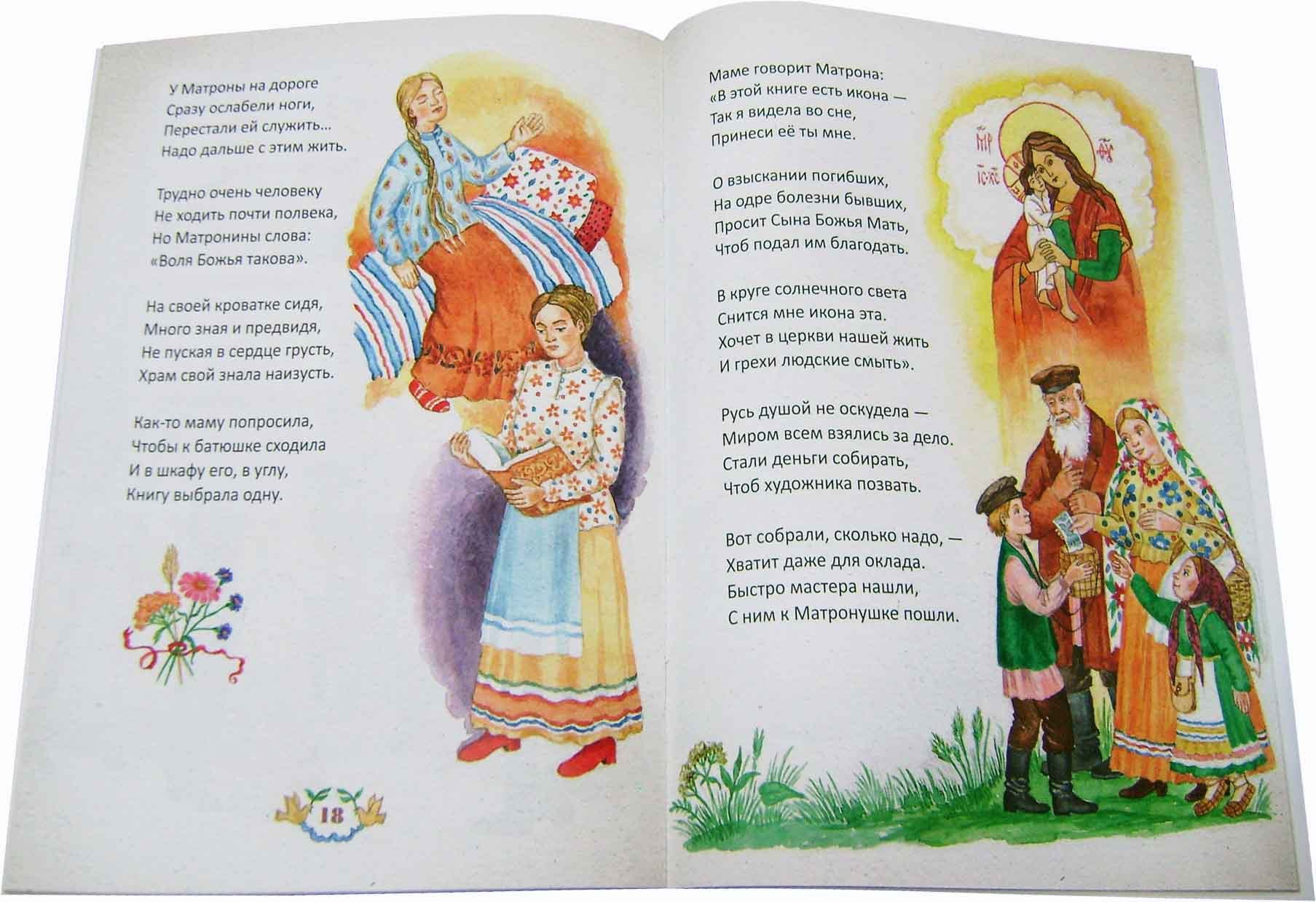 Стихотворное изложение жития святой блаженной Матроны для детей. Автор в простой и доступной форме рассказывает обо всех значимых событиях из жизни почитаемой московской святой. Святая блаженная Матрона Московская в своей жизни была лишена всех земных благ, но так чутко откликалась на горести приходящих к ней за советом! И до сих пор не оскудевает людской поток у стен Покровского монастыря: к ее мощам идут и стар и млад со своими горестями и болезня-ми и, конечно же, благодар-ностью за обретенную по ее молитвам милость Божию.