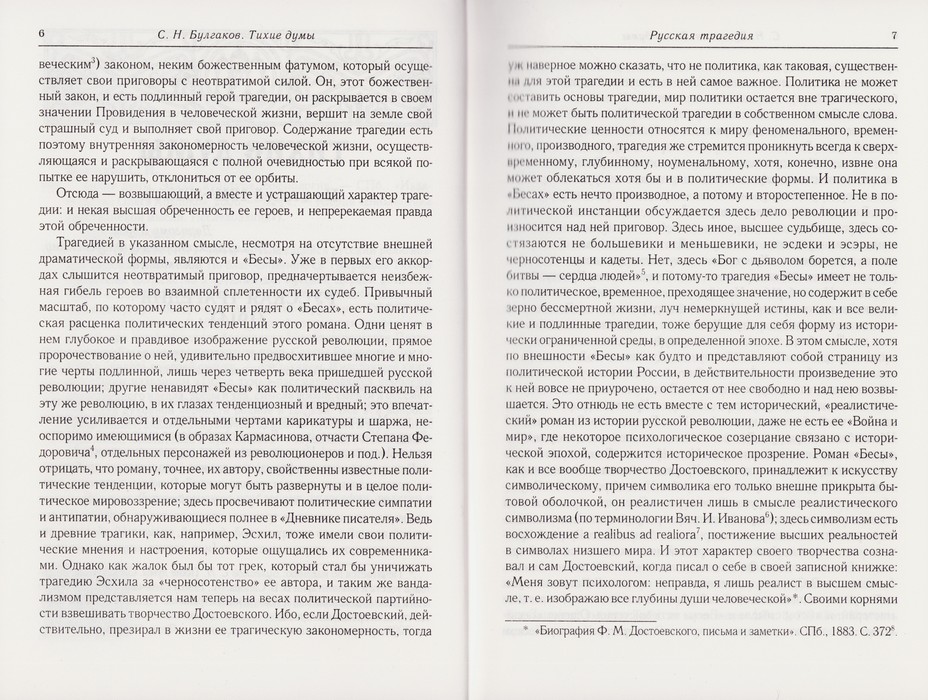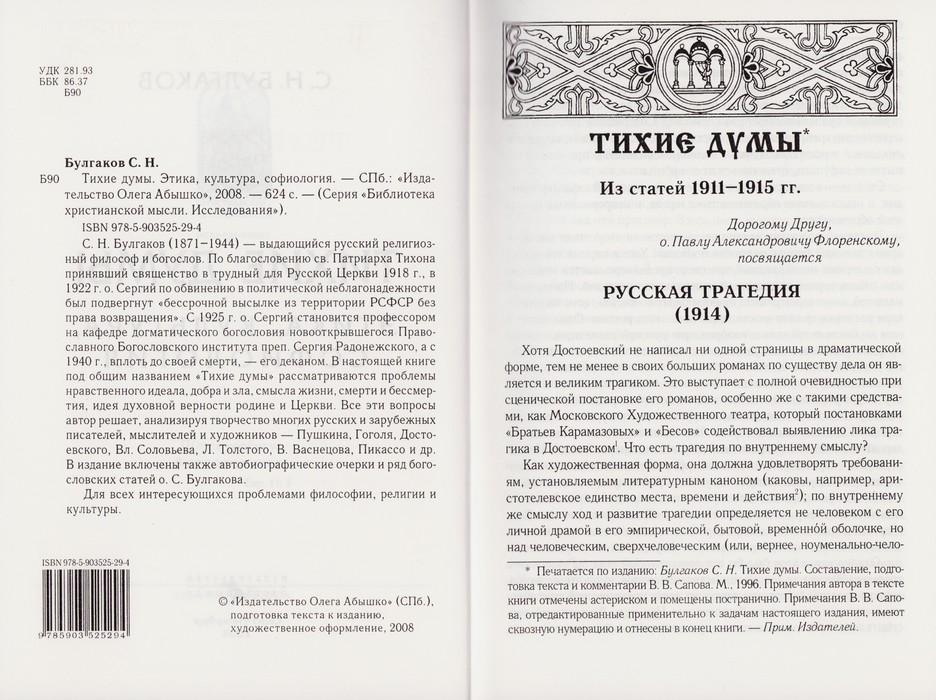 С. Н. Булгаков (1871 1944) выдающийся русский религиозный философ и богослов. По благословению св. Патриарха Тихона принявший священство в трудный для России 1918 г., в 1922 г. о. Сергий по обвинению в политической неблагонадежности был подвергнут "бессрочной высылке из территории РСФСР без права возвращения". С 1925 г. о. Сергий становится профессором на кафедре догматического богословия новооткрывшегося Православного Богословского института преп. Сергия Радонежского, а с 1940 г., вплоть до своей смерти, его деканом. В настоящей книге под общим названием "Тихие думы" рассматриваются проблемы нравственного идеала, добра и зла, смыла жизни, смерти и бессмертия, идея духовной верности родине и Церкви. Все эти вопросы автор решает, анализируя творчество многих русских и зарубежных писателей, мыслителей и художников Пушкина, Гоголя, Достоевского, Вл. Соловьева, Л. Толстого, В. Васнецова, Пикассо и др. В издание включены также автобиографические очерки и ряд богословских статей о. С. Булгакова.