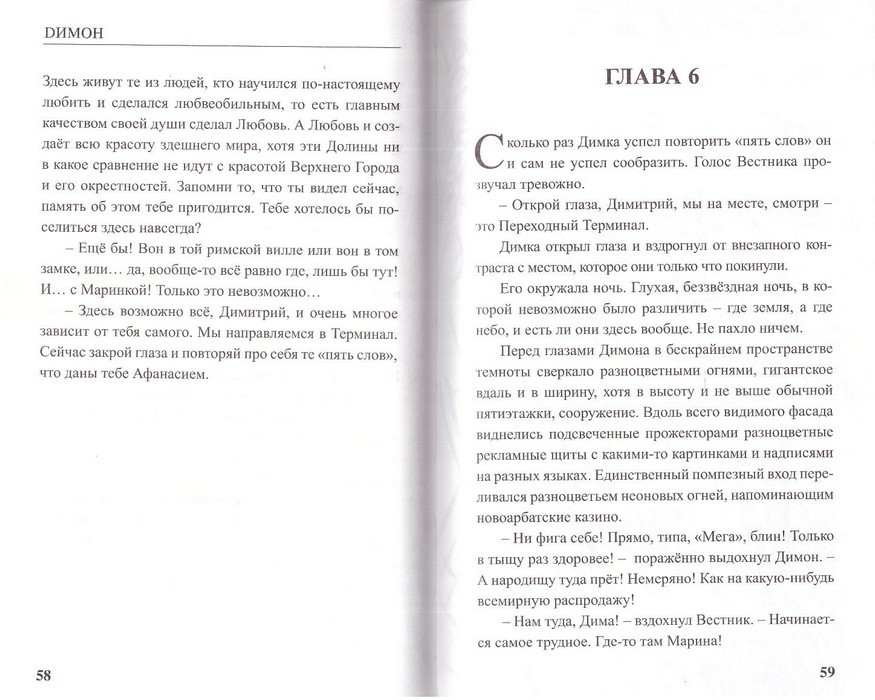 Жил-был Димон — рыжий одиннадцатикласник Димка. Был он безответно влюблён в первую красавицу школы Маринку. А она попала в автомобильную катастрофу и оказалась в коме. А кома оказалась Терминалом, куда Димон и отправился в надежде спасти свою возлюбленную. Некоторые литературоведы называют эту книгу «православным фэнтези», а некоторые афонские монахи считают её лучшим художественным изложением учения о мытарствах. Книга будет полезна не только подросткам, но и всем взрослым, которые хотят узнать, что их ждет после смерти.
