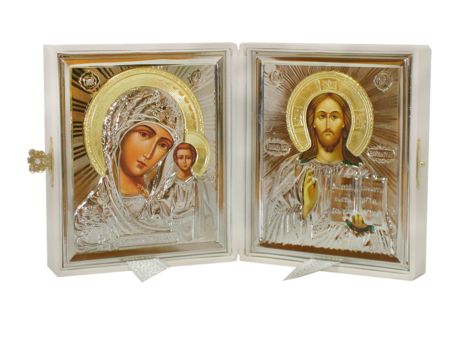 Складень венчальный двойной в футляре - визикрон "Пресвятая Богородица Казанская-Спаситель", размер иконы 11х13 см, риза, никель, золочение, эмаль.