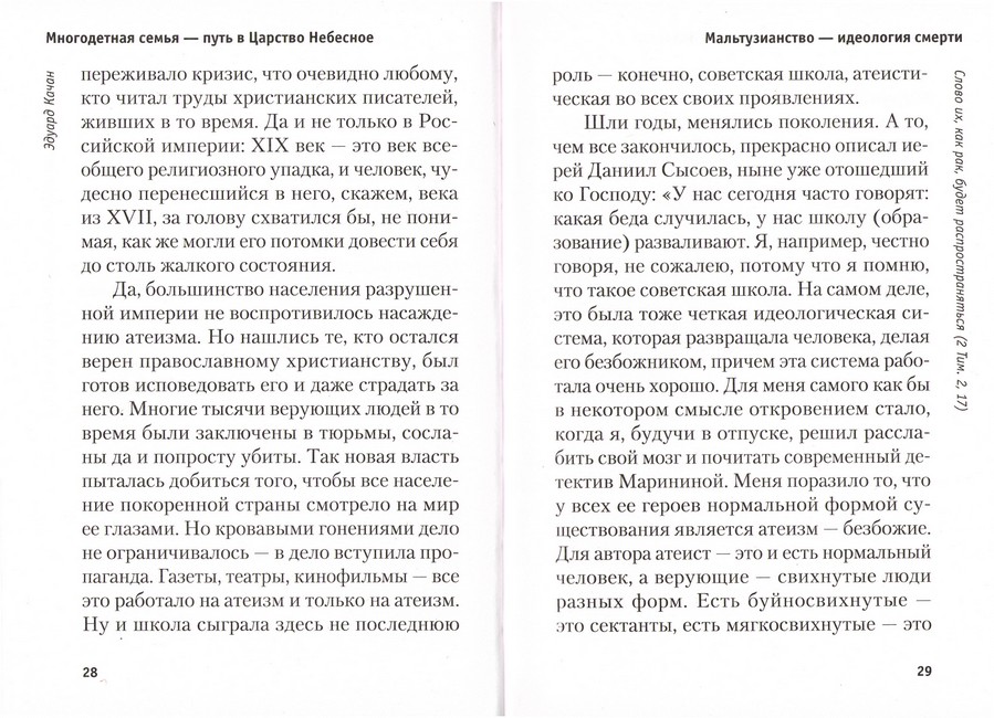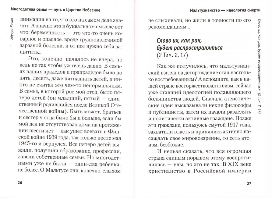 Эту книгу написал многолетий отец. В ней он рассуждает о том, кто автор общераспространенной сейчас идеи сокращения численности человечества (а у этой идем есть конкретный автор), рассматривает те методы, с помощью которых борцы с рождаемостью добиваются своих целей, и объясняет, почему все это для христианина неприемлемо. А после честно рассказывает о нормальной, традиционной, то есть многодетной семье, на собственном примере и на примере своих многодетных друзей и знакомых показывая все плюсы многодетности и те трудности, с которыми обязательно столкнется каждый, кто захочет создать большую семью.