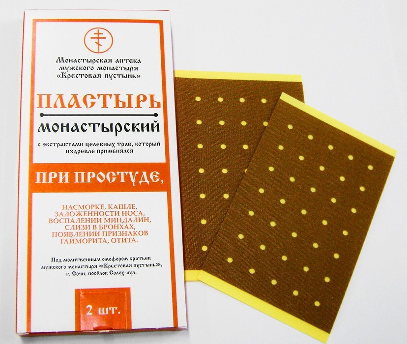 ПЛАСТЫРЬ монастырский с экстрактами целебных трав применяется как разогревающий, при болях в суставах, радикулите, боли в спине, остеохондрозе, артрите, артрозе, подагре, ревматизме, возрастных изменениях, отложении солей, бурсите, растяжении связок.