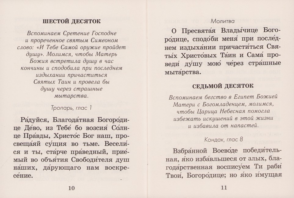 Богородичное правило, обнимающее собою всю жизнь Богоматери, разделено на 15 десятков по важнейшим событиям в Ее жизни. Молитва «Богородице Де́во, радуйся...» читается 150 раз: перед каждым десятком полагается молитва «Отче наш...», после каждого десятка — «Милосердия двери отверзи нам...», а также дополнительные молитвы.