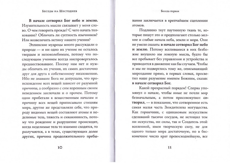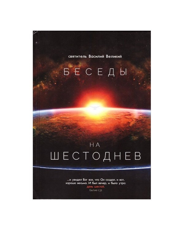 Богословский труд Василия Великого «Шестоднев» —девять бесед на первую главу Книги Бытия — замечателен не только своим глубоким религиозным настроением, но и по тем философским и научным выводам, которые сохранили свою ценность и для настоящего времени. Текст первых девяти бесед приводится по изданию: Творения иже во святых отца нашего Великаго, Архиепископа Кесарии Каппадокийския. Ч. 1.