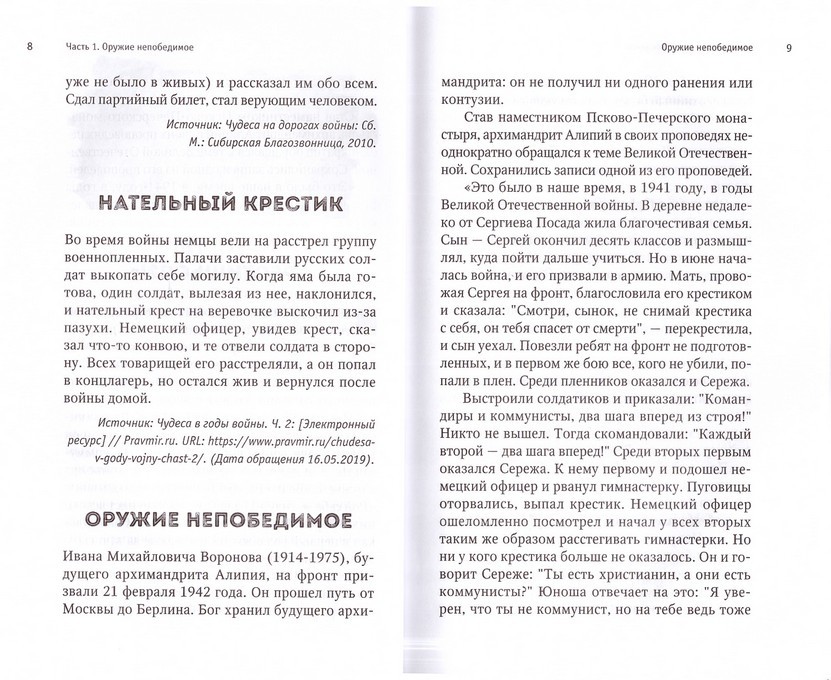 Для удобства чтения сборник разделен на восемь частей, соответствующих разным темам: о непобедимости креста, о силе веры, о защите неправедно осужденных, о помощи Господа, Богородицы и святых, об обращении к Богу от злого неверия. И во всех восьми частях мы находим живые примеры спасения человека от гибели и обращения к Истине.