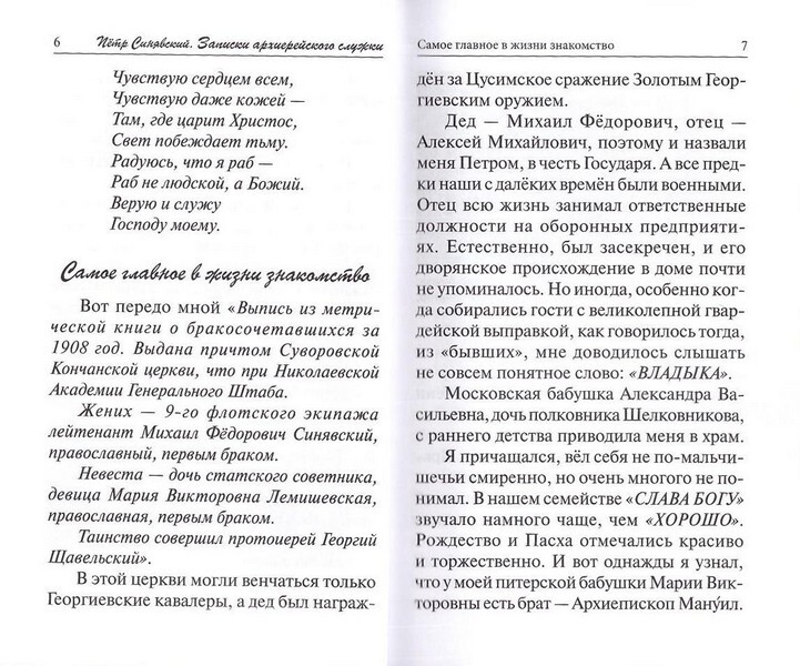 Петра Алексеевича Синявского хорошо знают дети и их родители. Потому что он — прежде всего детский поэт. Но мало кому известно, что, будучи внучатым племянником митрополита Мануила (Лемешевского), он также был духовным чадом приснопамятного митрополита Иоанна (Снычёва, †2 ноября 1995 года). Сам владыка называл его своим служкой, поэтому Пётр Алексеевич так и озаглавил свою книгу — «Записки архиерейского служки». В них — неизбывная любовь к архипастырю, щемящая боль за его физические немощи и свои собственные промахи и — немножко поэзии...