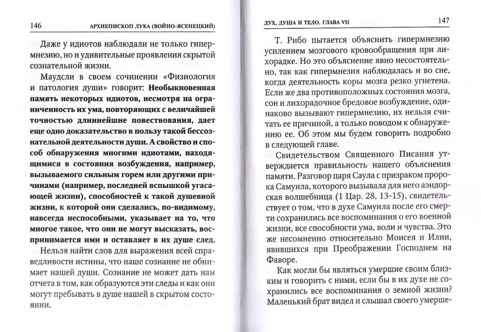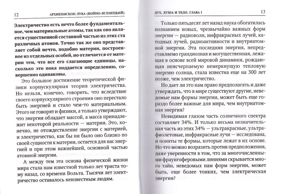 В своем труде «Дух, душа и тело» святитель Лука (Войно-Ясенецкий), выдающийся хирург и пламенный проповедник, признавая влияние телесной стороны человека на духовную, видит и обратное влияние духа на тело, и «духом» называет сферу, где преобладает и владычествует духовная сторона, а «душою» – ту сферу, где духовное сопряжено с телесным теснейшим образом и зависит от него.