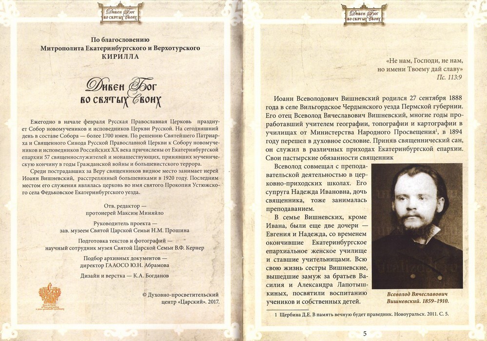 Среди пострадавших за Веру священников видное место занимает иерей Иоанн Вишневский, расстрелянный большевиками в 1920 году. Последним местом его служения являлась церковь во имя святого Прокопия Устюжского села Федьковское Екатеринбургского уезда.