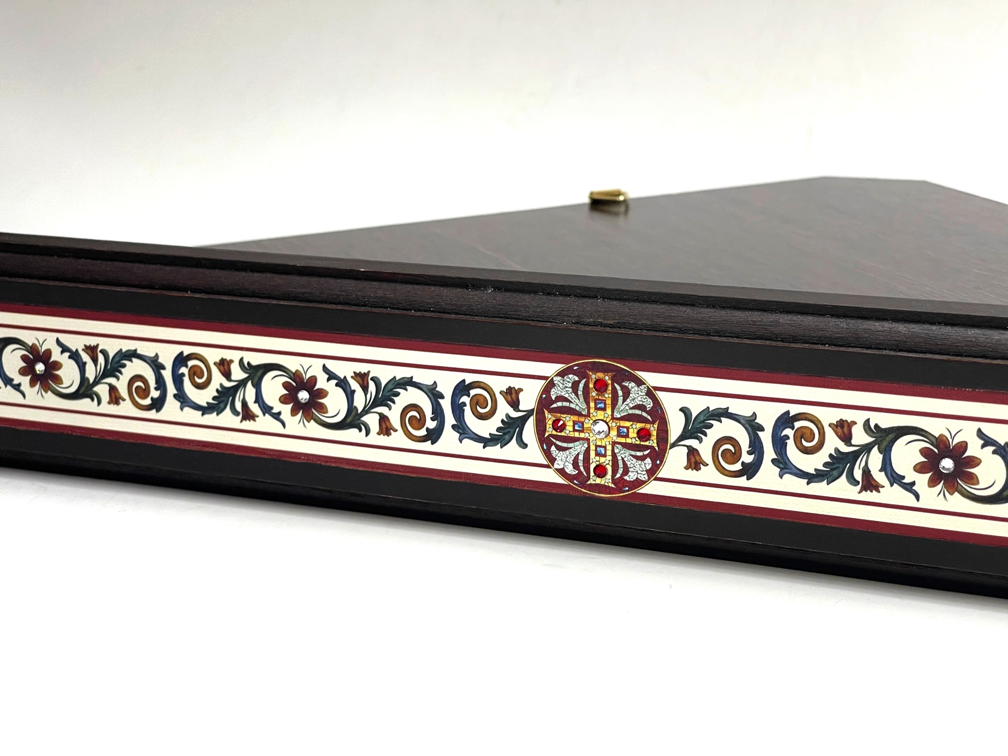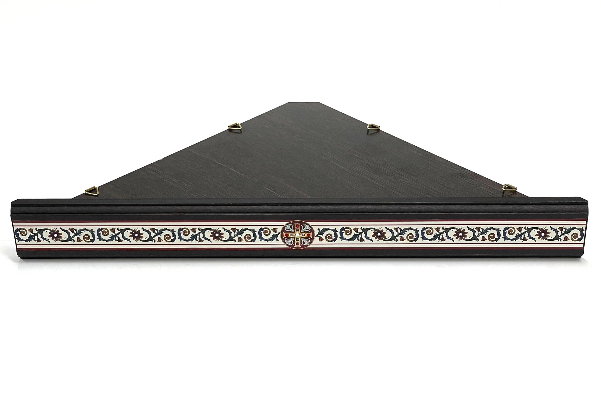 Полка угловая для икон со стразами. Есть два варианта исполнения: рисунок нанесен на холст / рисунок нанесен прямой печатью на дерево. На лицевой стороне фронтона рисунок: растительный орнамент, крест со стразами.