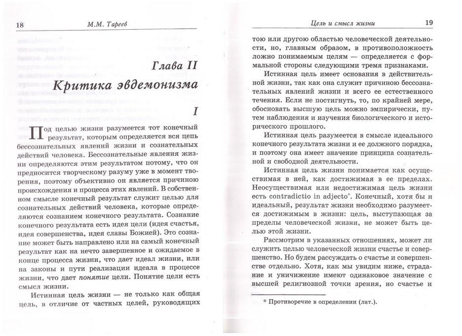 Дискуссии о смысле жизни в русской периодике начала XX века безусловно оказали влияние на замысел масштабного сочинения профессора Московской духовной академии Михаила Михайловича Тареева (1866-1934), русского православного богослова и экзегета — «Цель и смысл жизни» (1901). М.М. Тареев связывает проблему смысла жизни с теодицеей, и здесь проявляются своеобразные черты, заметно выделяющие богословскую систему Тареева среди традиционных, перегруженных схоластическим юридизмом трудов по «нравственному богословию». Основное логическое ударение Тареев ставит на самоуничижении Спасителя. Зло в мире не может быть оправдано никаким «божественным планом»: оно — следствие греховной воли, и подлинное богооправдание состоит в том, что ради преодоления этого зла Сын Божий добровольно пошел на самоуничижение, страдания и смерть. Цель человеческой жизни — слава Божия. Она достигается только в подлинно духовной жизни, которая состоит в непрестанном богообщении.