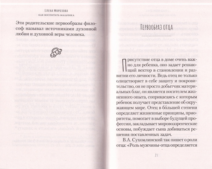 В книге известного психолога Елены Анатольевны Морозовой поднимаются важные вопросы, касающиеся воспитания будущего мужчины в семье. По словам ученого, доктора медицинских наук Владимира Базарного, «если мы спасем мальчиков и сбережем мужчин, то будет у нас народ, а значит, и будущее». Эта книга — прекрасный «путеводитель» по наиболее важным аспектам воспитания. Она, несомненно, будет полезна самой широкой аудитории: и молодым людям, вступающим в брак, и родителям, воспитывающим сыновей, и специалистам — педагогам, психологам — теоретикам и практикам, занимающимся вопросами семьи и воспитания детей.