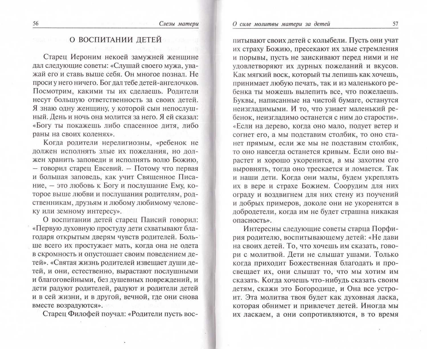 Книга «Слезы матери» представляет собой сборник рассказов, воспоминаний, писем, проповедей священников, посвященных теме материнства. Повествования, приведенные в книге, очень поучительны. Основанные на реальных примерах, они показывают великую и действенную силу материнской молитвы за детей, помогают сохранить спокойствие в самых отчаянных ситуациях, призывая неуклонно обращаться с горячей молитвой к Господу, Пречистой Его Матери, к святым Православной Церкви, уповать на их помощь и заступление. Впервые книга была издана в 2001 году и неоднократно переиздавалась с дополнениями.