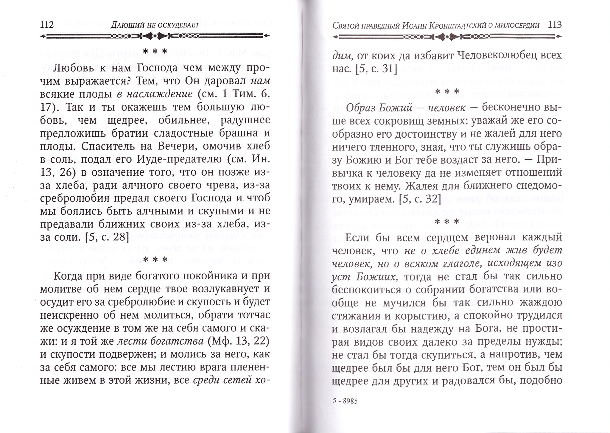 Данная работа представляет собой сборник изречений святого праведного Иоанна Кронштадтского о милосердии, взятых из его многочисленных творений. Вся жизнь святого праведного Иоанна Кронштадтского была пронизана мудрой и деятельной любовью к Богу и людям. Предлагаемые читателю размышления о. Иоанна о милосердии обладают особой убедительностью и значением, необыкновенной силой и глубиной при всей доступности для понимания даже простыми людьми. Слова святого Иоанна о милосердии и сострадании к тем, кто, быть может, зачастую вызывает в нас лишь раздражение и недовольство, помогут нам в своей жизни и поступках стараться исполнить евангельскую заповедь о любви к ближнему. Издание рассчитано на широкий круг православных читателей.