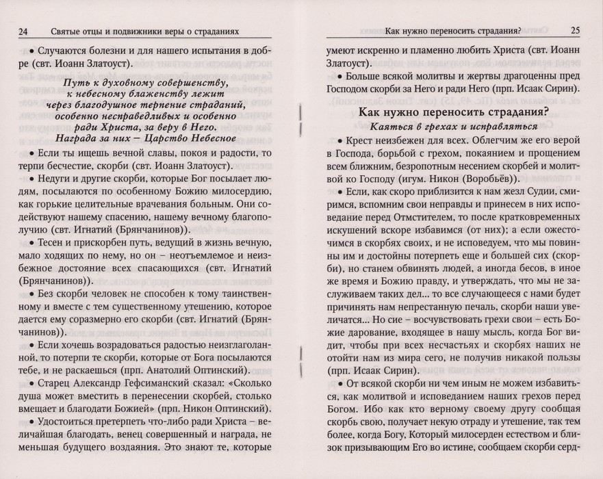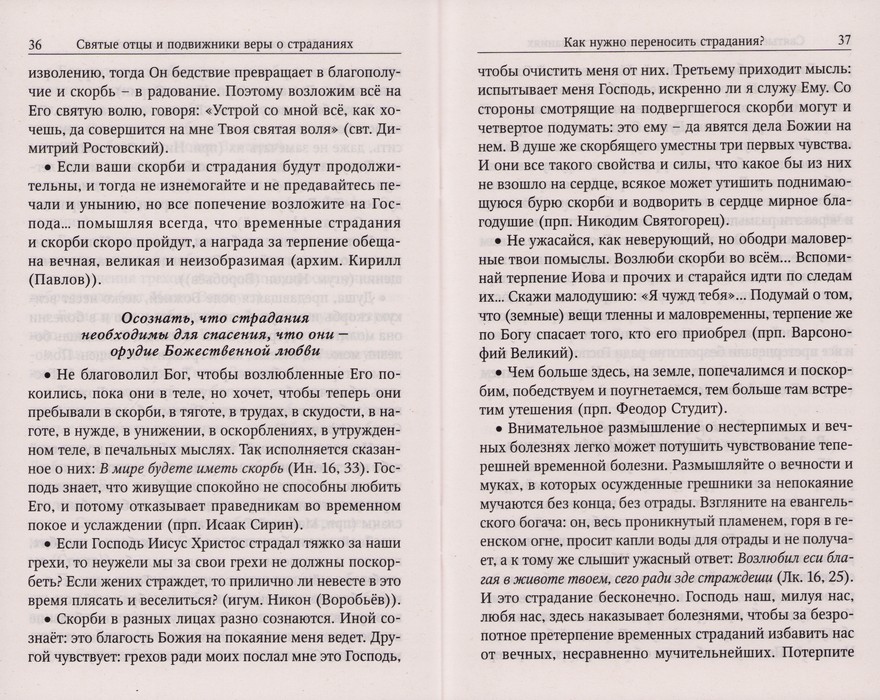 Книга содержит многочисленные высказывания святых отцов и учителей Церкви о страданиях, а также несколько молитв, читаемых во время душевной или телесной тяготы.