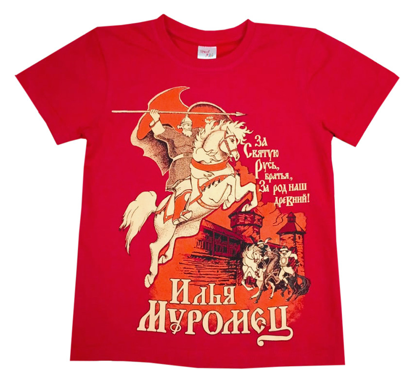 На груди футболки изображен Илья Муромец на коне.