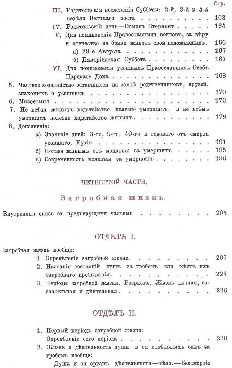 Представленное сочинение состоит из 4-х частей. В первой части подробно рассматривается смерть в отношении к бессмертию. Во второй части раскрывается внутренняя связь и взаимное отношение между живыми и мертвыми. Третья часть посвящена учению Церкви о ходатайстве живых за умерших и испрошении прощения грехов некоторым умершим грешникам. В четвертой части подробно описывается загробная жизнь.