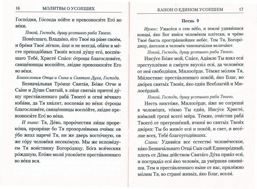 Ушедшим из этого мира нашим близким уже не нуж­но ничего, кроме молитв и подаваемой за них милостыни. В этой брошюре собраны молитвы о усопших, которые мы можем совершать дома и на кладбище. Кафизма 17 по уставу исполняется на отпевании и панихиде, поэто­му, если нет возможности читать полностью Псалтирь в память о усопших, можно читать хотя бы эту кафизму.