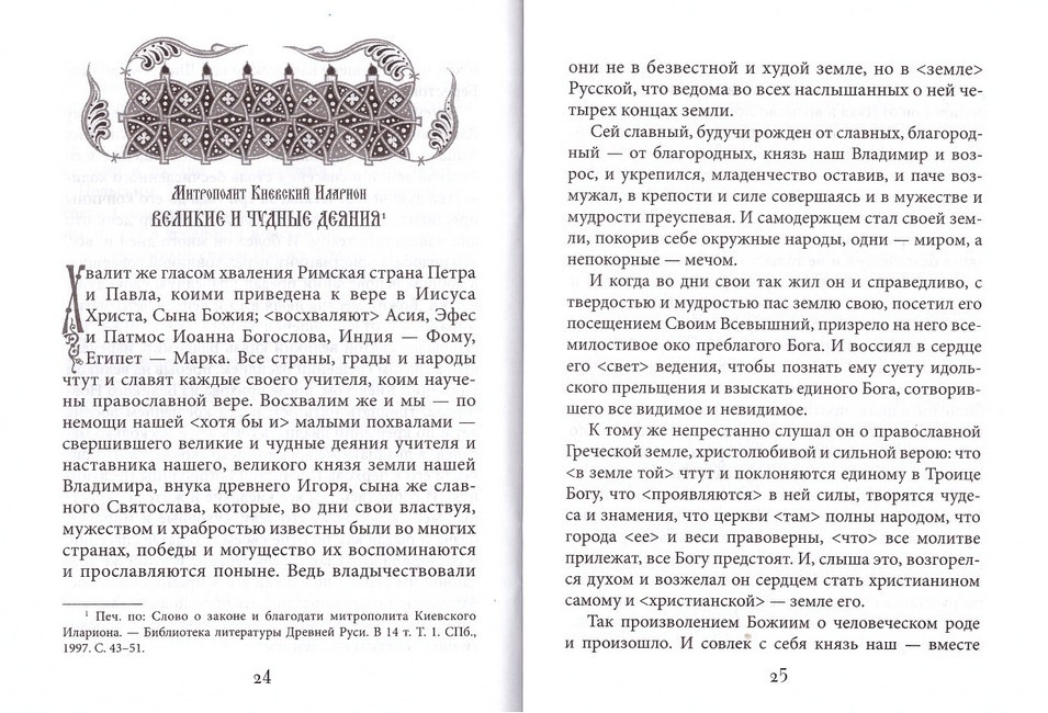 Книга посвящена 1000-летию преставления святого равноапостольного великого князя Владимира, по призыву которого Русь крестилась в православную веру. В публикуемых текстах — жизнеописании святого Владимира, составленном по книге житий святых митрополита Димитрия Ростовского, и отрывке из «Слова о законе и благодати» митрополита Киевского Илариона — раскрывается духовный облик великого князя, обратившегося из тьмы язычества к христианскому благочестию и просветившего светом Православия Русскую землю. Оба текста печатаются в переводе на современный русский язык. Издание рассчитано на широкий круг читателей.