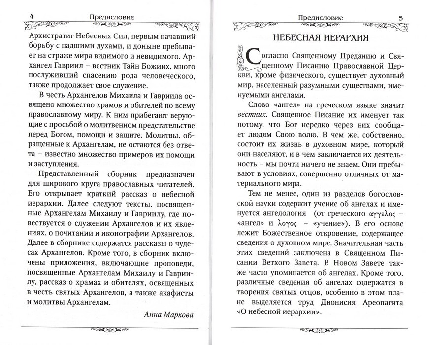 В книге повествуется о служении Архангелов и их явлениях, о почитании и иконографии Архангелов. Далее в сборнике содержатся рассказы о чудесах Архангелов. Кроме того. в сборник включены приложения, включающие проповеди, посвященные Архангелам Михаилу и Гавриилу, рассказ о храмах и обителях, освященных в честь святых Архангелов, а также акафисты и молитвы Архангелам.
