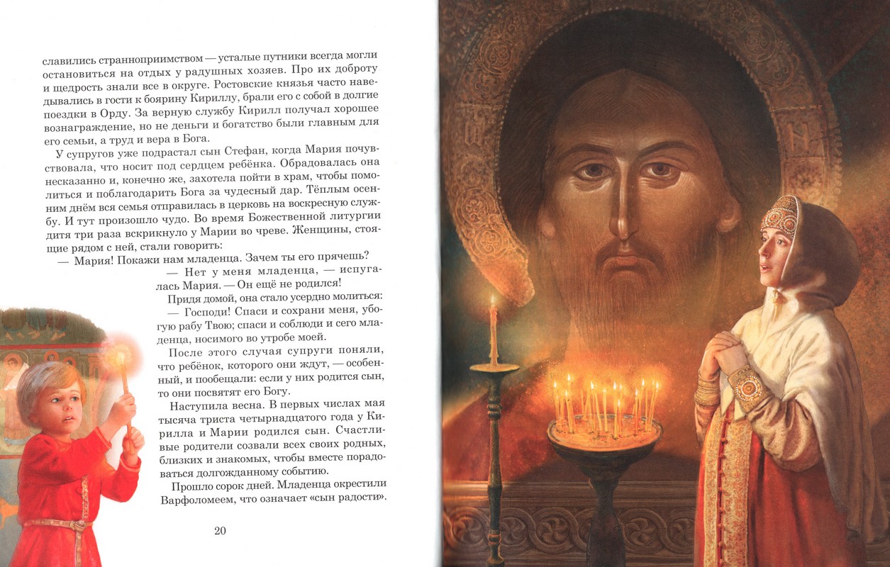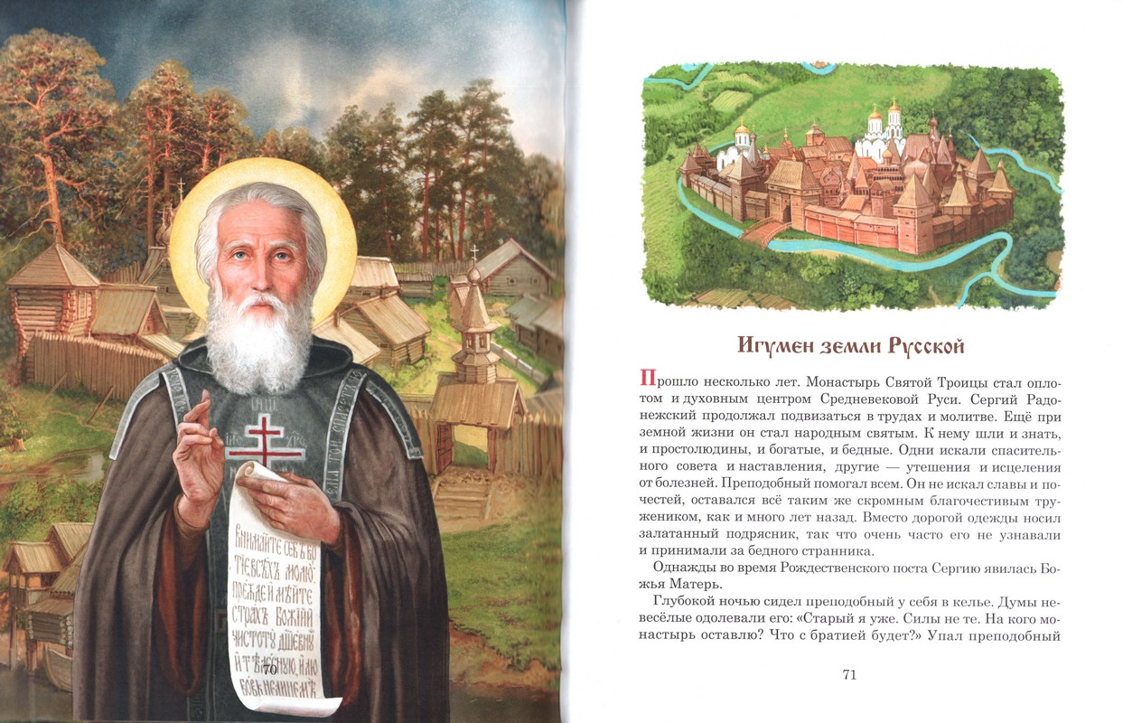 Под стягами Древней Руси, под звон колоколов, разворачивается невероятная история о святом Сергии Радонежском, который был не только молитвенником и заступником, но и собирателем земель русских. На страницах этой чудесной книги оживают далекие временя, когда князь Владимир нес свет христианства на Русь. Вы узнаете о подвигах и духовных открытиях преподобного Сергия Радонежского. Он основал сияющий монастырь — Троице-Сергиеву Лавру, — ставший настоящей жемчужиной среди других монастырей, где каждая стена дышит молитвами и верой. Юные читатели вместе с родителями погрузятся в мир доблести и отваги, узнают о храбрости князя Дмитрия Донского на поле Куликовом, о поединке воина-монаха Пересвета с коварным Челубеем и победе воинства русского над татаро-монголами.