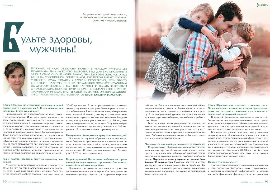 Из номера в номер журнал рассказывает о высоком предназначении женщины, о женских судьбах, любви, чудесах веры, здоровье, нравственных основах брака, семейных взаимоотношениях, воспитании детей, русских традициях.
